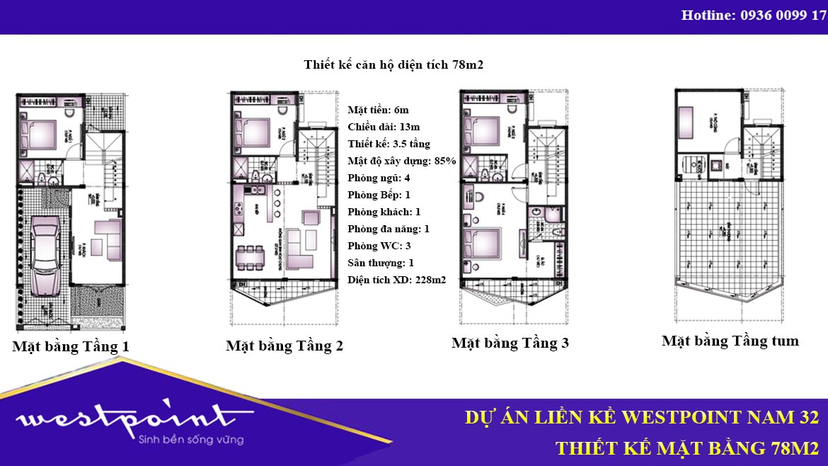Về diện tích 72m2, 78m2 tương đối giống nhau về thiết kế, chỉ khác nhau ở chiều dài căn hộ. Mặt tiền rộng 6m được chia đôi, 1 phần cho phòng khách, 1 phần bố trí làm gara oto. Từ tầng 2 đến tầng 3 có thể bố trí tối thiểu 4 phòng ngủ. 2 WC. Phù hợp với gia đình có tầm tài chính vừa phải.